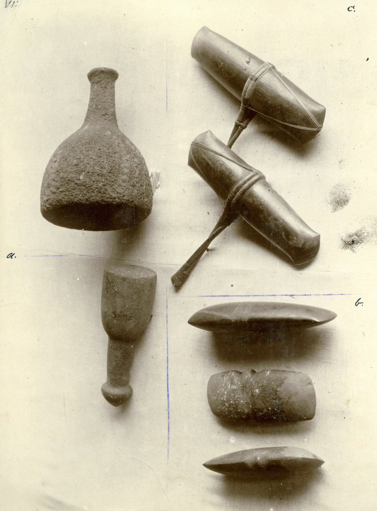 "Steingerät: a Stößel, b Axtklingen, c Steinäxte mit Handhabe." | Ex Situ